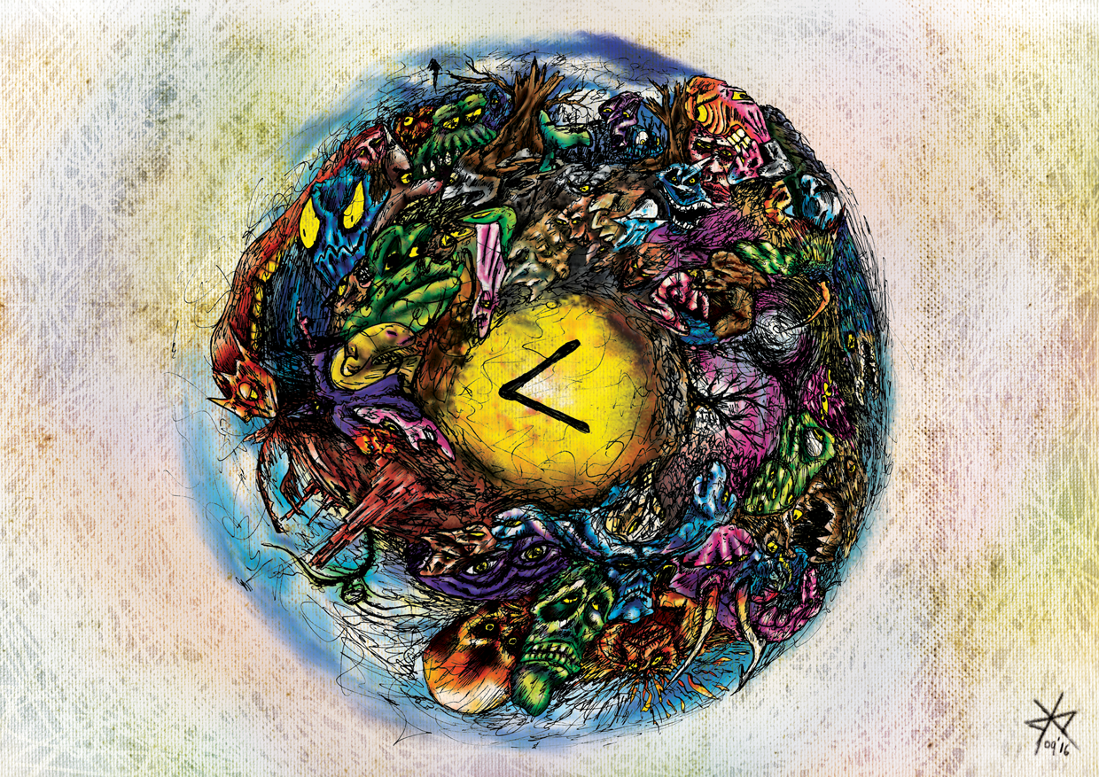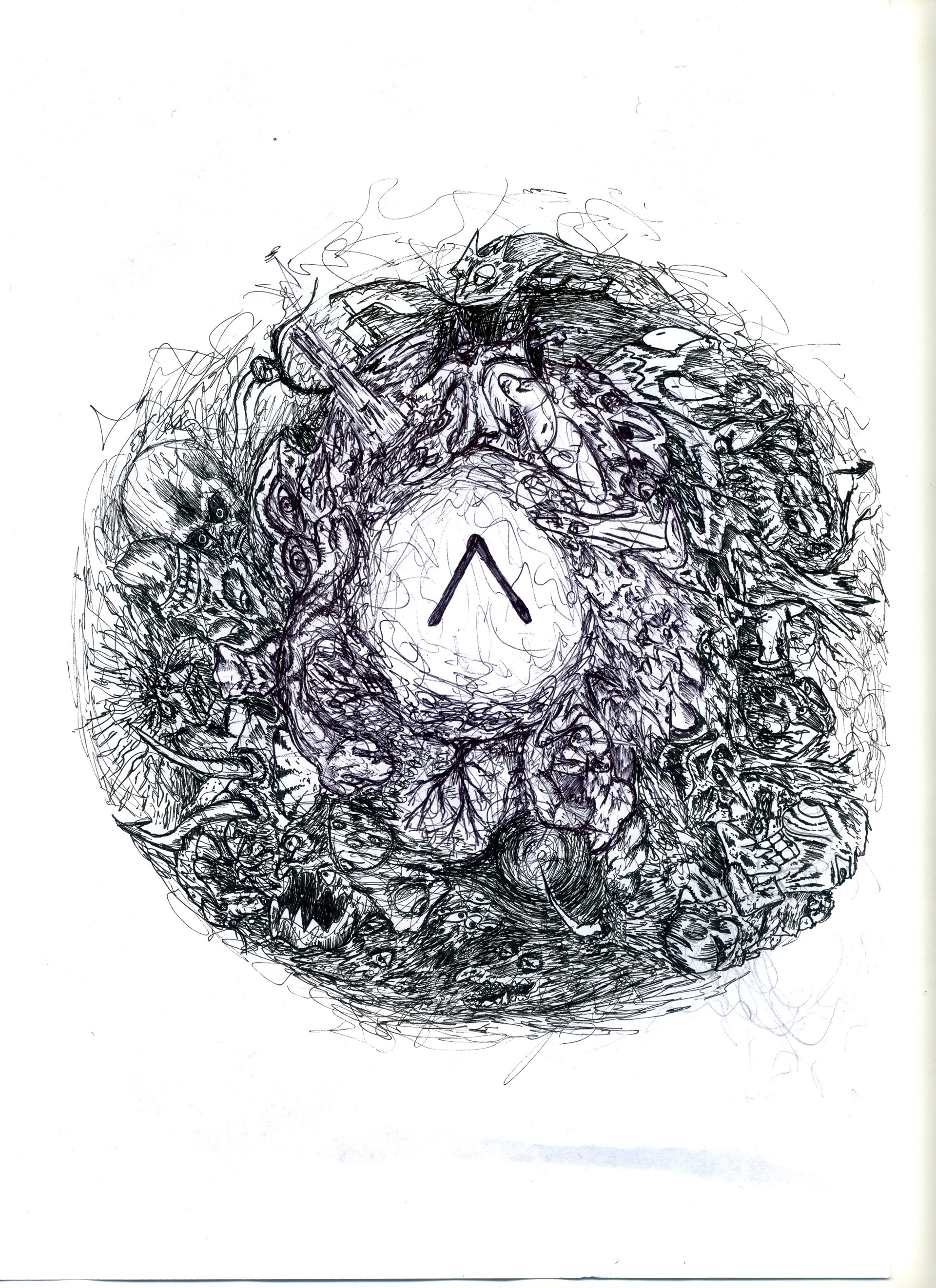 Pen and ink illustration of the Kenaz rune, further painted in Photoshop.