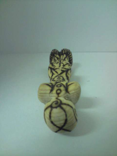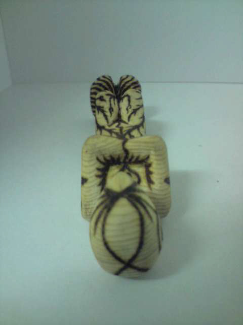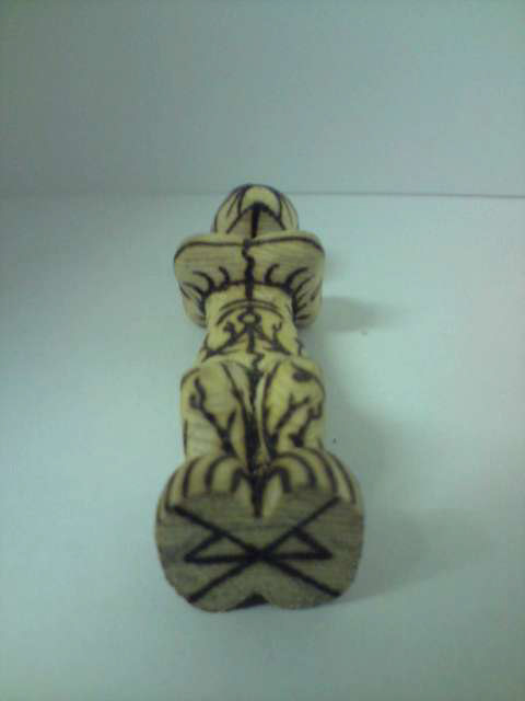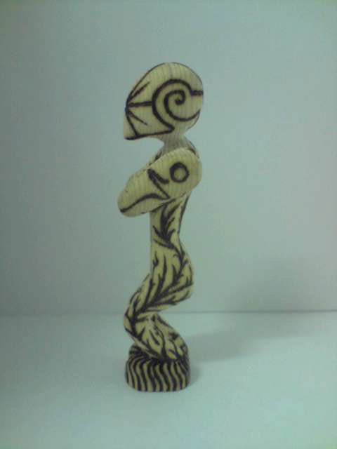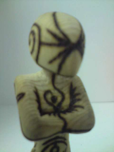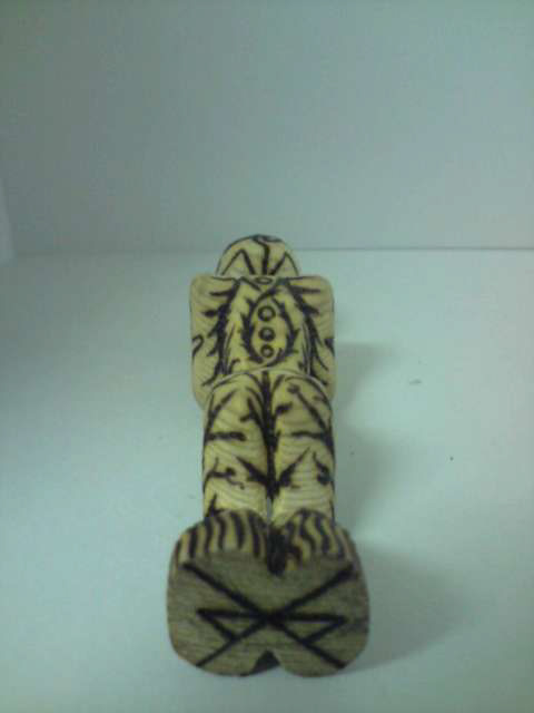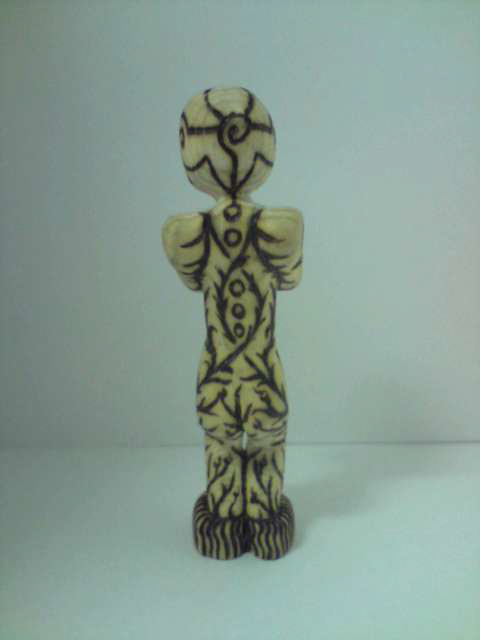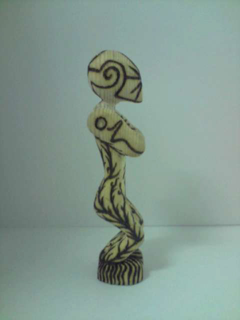 Carved wooden figurine with pyrography decoration.